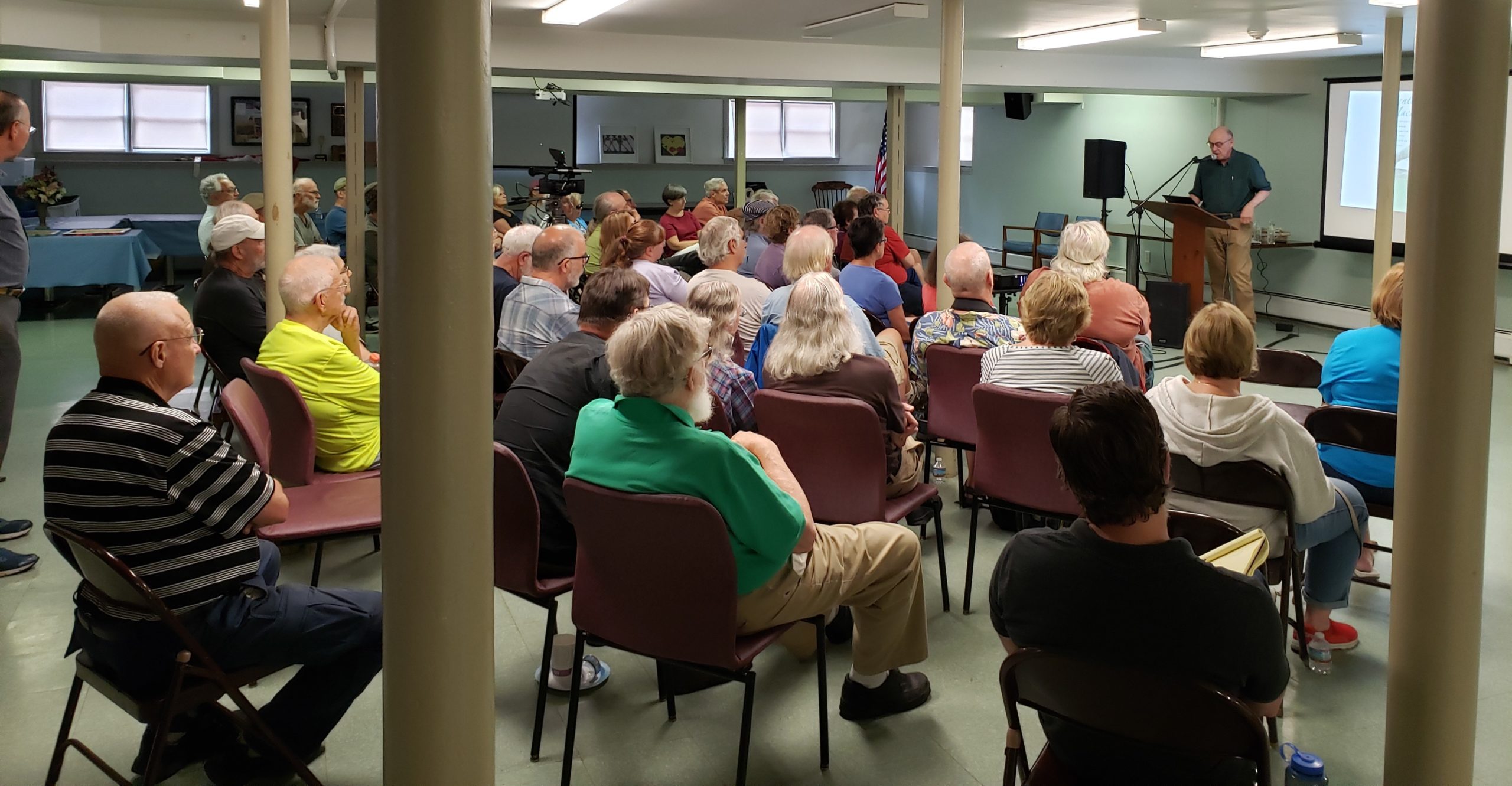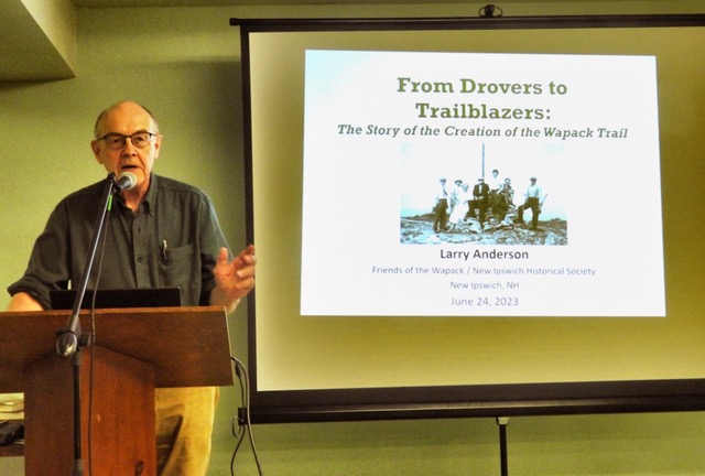 Our second centennial event, done in collaboration with the New Ipswich Historical Society(NIHS), was a presentation by Larry Anderson. Larry is a freelance author and biographer of Appalachian Trail creator Benton MacKaye. MacKaye was a frequent visitor to the Wapack Lodge. The event was held at the New Ipswich Congregational Church hall. Larry’s topic was “From Drovers to Trail Blazers, the story of the creation of the Wapack Trail.” Larry described the annual cattle drives from Concord MA to New Ipswich, in which Frank Robbins and Marion Davis participated. His main focus was placing the creation of the Wapack Trail in the context of the long distance trails movement of that time, including the Appalachian Trail, and showed how the Wapack Trail played an important role in that movement. The talk was very well received by the more than 65 attendees. There were exhibit items from the FOW and the NIHS. Refreshments were served.