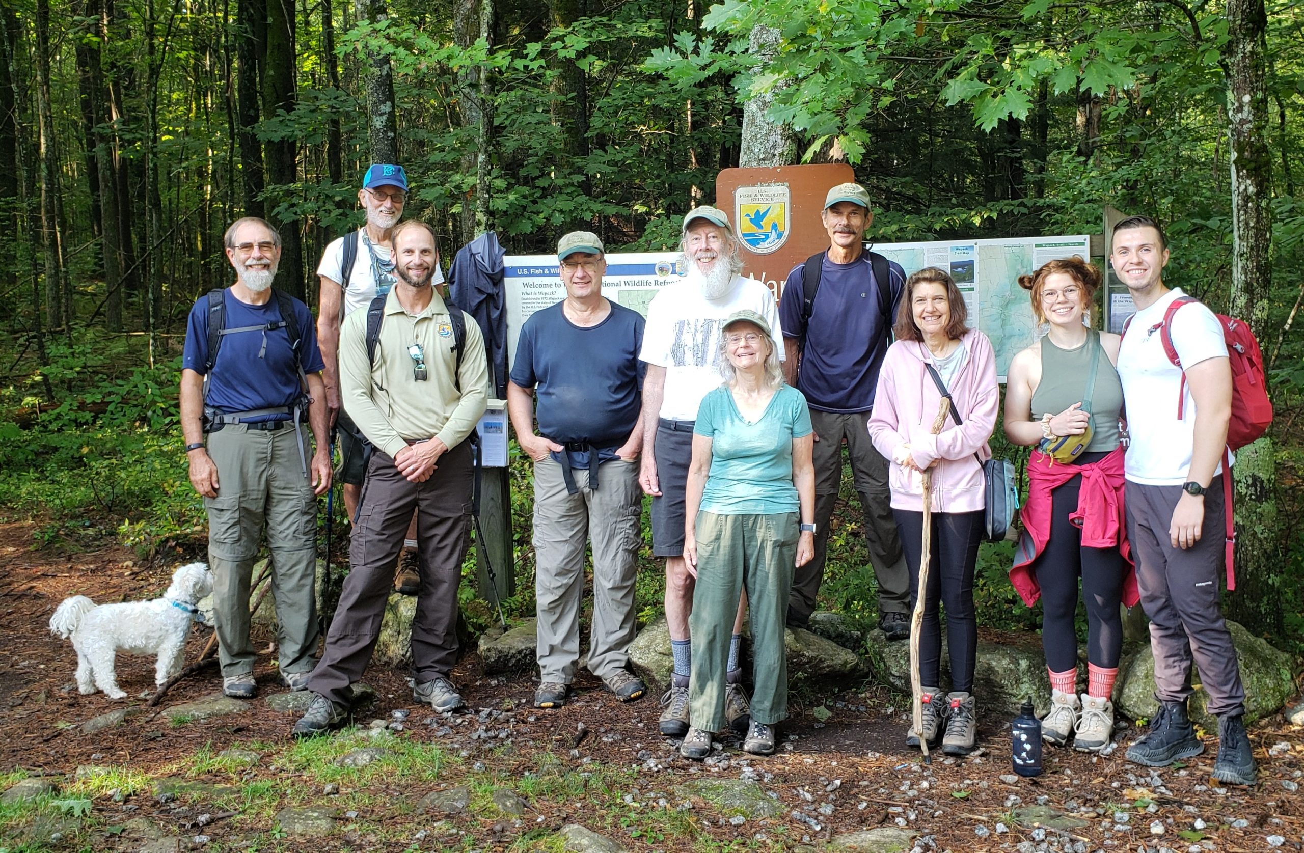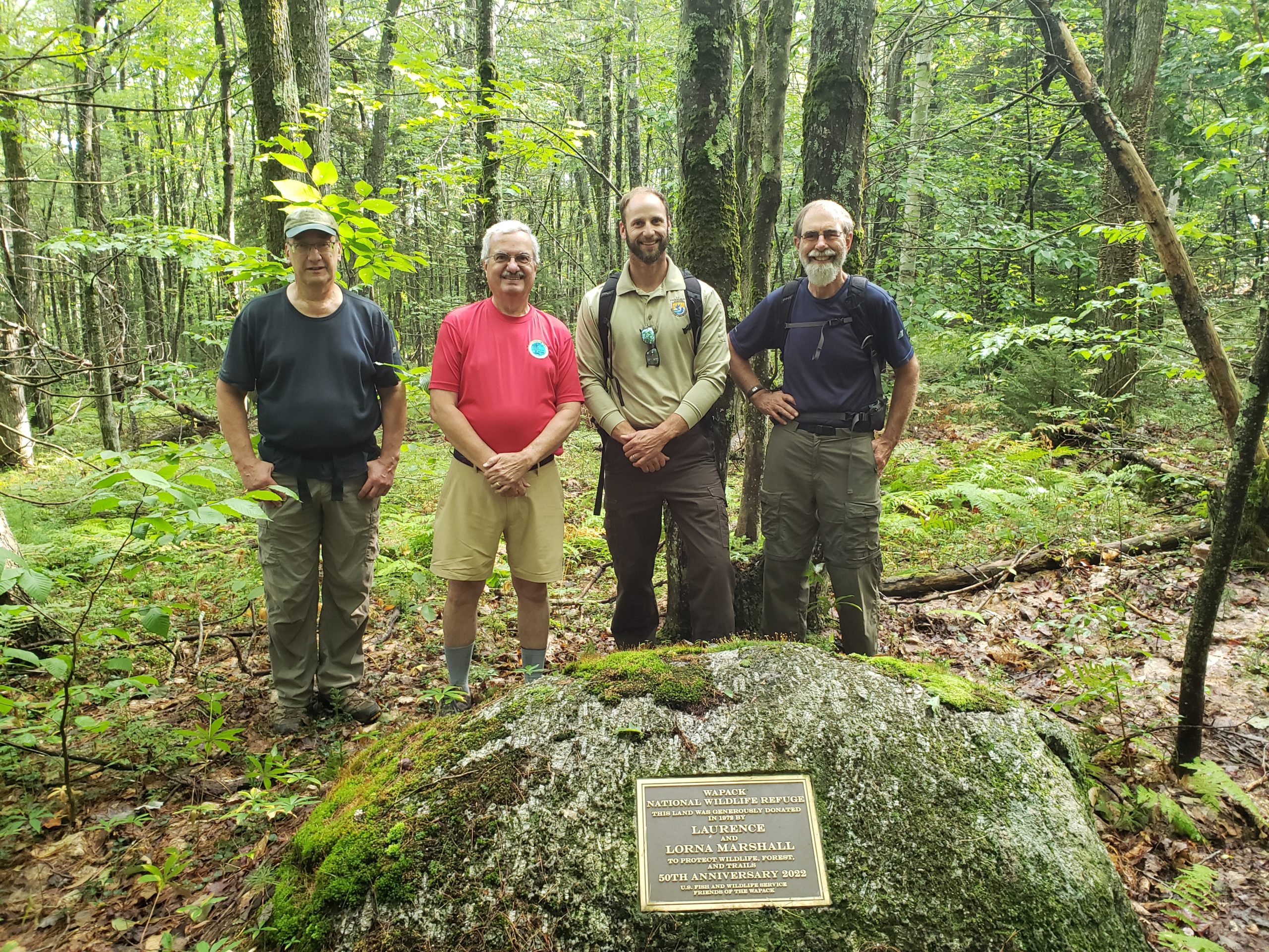 Despite the fore-cast, we had a good turn-out for our September 9thhike at the Wapack National Wildlife Refuge to the summit of North Pack. The hike was co-lead by refuge manager Matt Hillman, and FOW board member Bruce Myrick. Matt spoke about the Refuge and answered questions along the way. Last year we celebrated the 50thanniversary of the refuge with the US Fish and Wildlife Service and erected a plaque to honor the donation of this land by Laurence and Lorna Marshal.